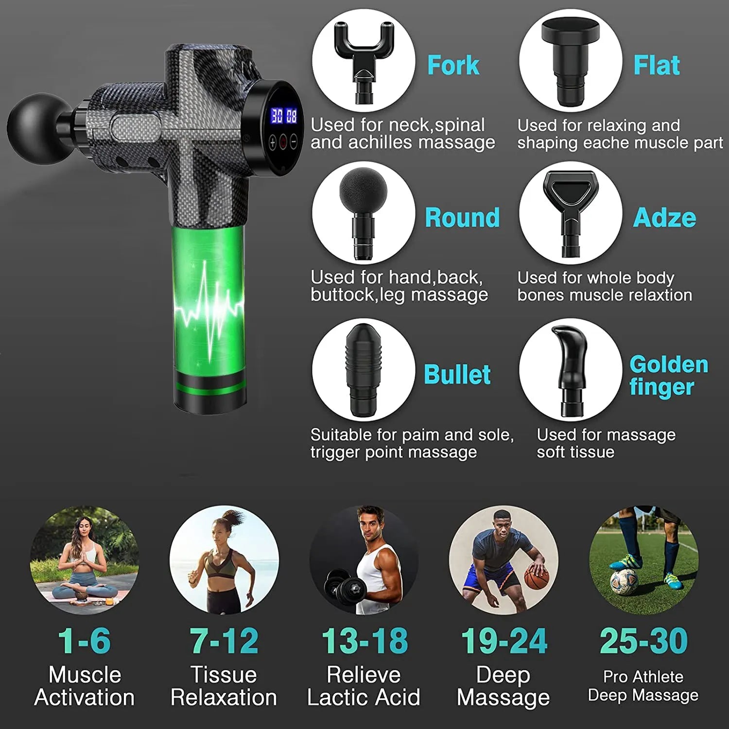 Grâce à ses percussions puissantes et à ses 6 têtes de massage interchangeables, notre pistolet de massage vous offre une relaxation musculaire profonde, vous permettant de vous détendre après une longue journée de travail, de soulager les tensions liées à l'exercice ou de réduire le stress quotidien.